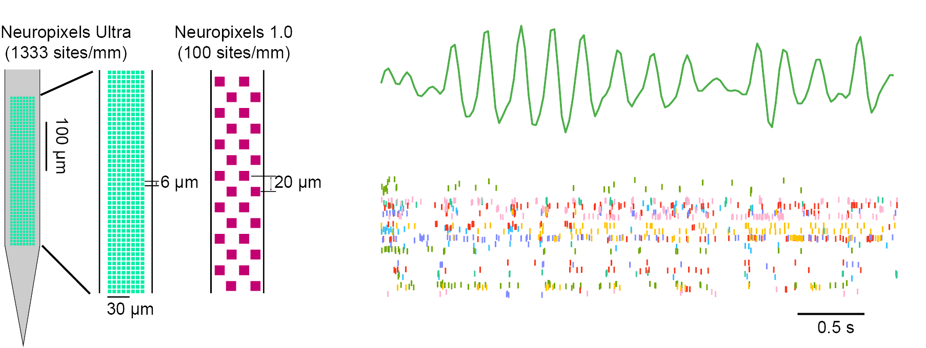 由我和合作团队开发的Neuropixels Ultra/HD 探针,非常适合在特定脑区内高密度采集单神经元的活动。通过将这些单细胞活动电记录与光遗传学技术结合,我们能够解析特定细胞类型对调节全皮层神经动态的贡献。